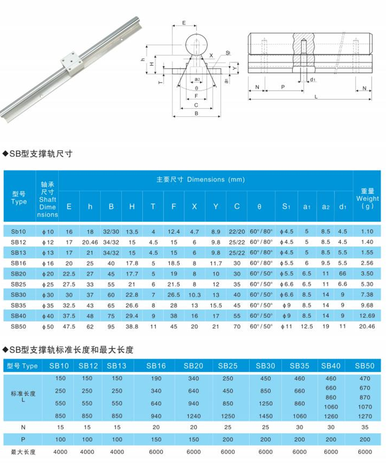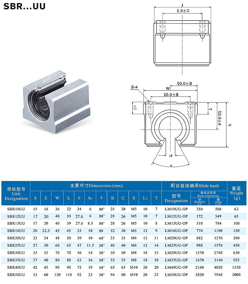 Shaft diameters range from 10mm to 50mm, including two series: the standard SBR UU and the extended SBR LUU. Key specifications and parameters are listed below (refer to the actual product for precise values):