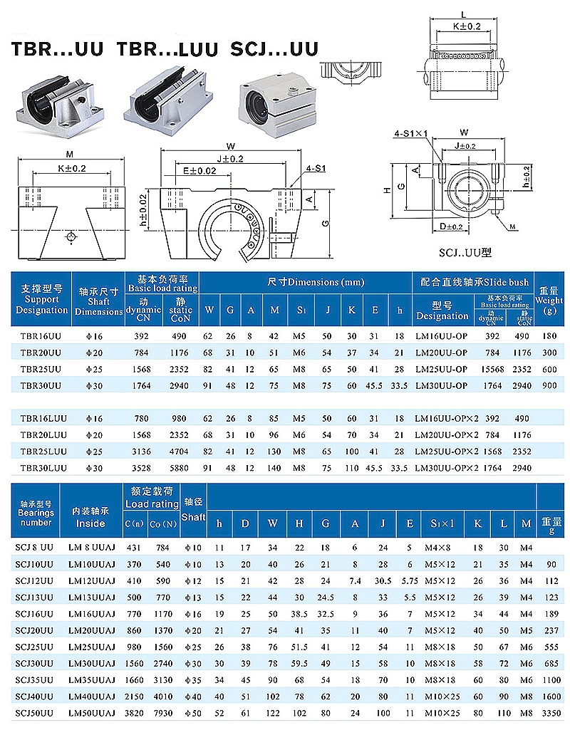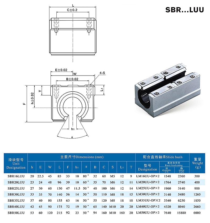 Note: Custom sizes are available for non-standard equipment. The extended SBR LUU shares the same mounting hole specifications as the standard SBR UU, enabling direct replacement. Its load-bearing parameters meet industrial standards, and it is compatible with optical shafts of the same diameter, requiring no adjustments to the equipment structure after replacement.